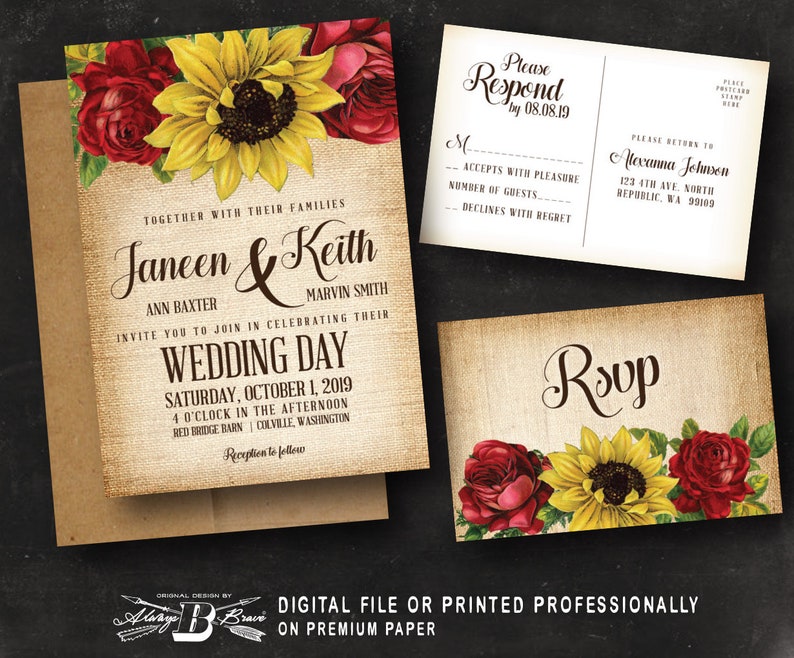 Rustic Sunflower Wedding Invitation, Vintage Wedding ... from s3.weddbook.com Get away from the rush of the city there's something humble about wedding invitations with a sunflower design that make them perfect for a casual wedding. Sunflower wedding invitations are perfect choice for late summer and fall weddings. Wedding invitation rsvp card reception card details card save the date card thank you card wedding program these templates are professionally designed and 100% customizable with the online editor that you.
