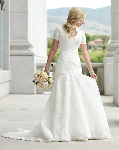 Modest Mermaid Short Sleeve Lace Wedding Dress With ... from www.sofiehouse.co Choose one of these breathtaking mermaid dresses for your next gala, wedding, military ball, or other formal occasion. Shop mermaid style wedding dresses at bhldn! Our high quality modest wedding gowns with latest fashion elements will make you look stunning bateau lace half sleeve pleated wedding dress with lace ribbon.